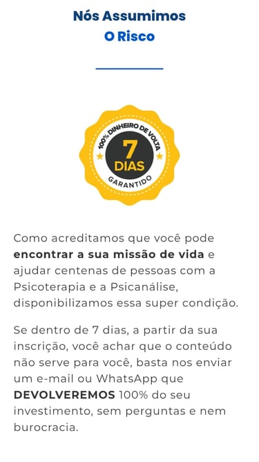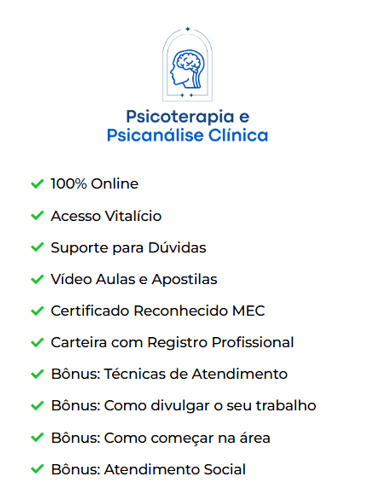 PSICOTERAPIA: Este curso oferece uma visão abrangente dos princípios e práticas da psicoterapia. Abordaremos as principais abordagens teóricas, incluindo a psicanálise, terapia cognitivo-comportamental, terapia humanista e terapia sistêmica. Psicanalise . Esse curso tem 2 certificações Curso livre 1028 hs Extensão universitária ( emitido pela Unifatec ) 600 hs Mais de 200 vídeos Ministrantes: Professor Rogério Temporim Professora Ana Esteves Professora Marília Gabriela Gonçalves Curso Online